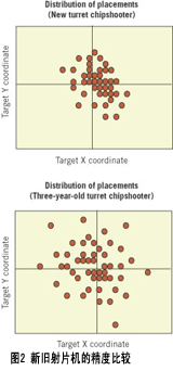 轉盤式射片機經過較長時間的使用,由于零部件開始磨損,也會出現元器件拾取和貼裝精度問題。由于絲杠和凸輪表面開始磨合(或磨損),X-Y工作臺、轉盤貼裝頭、θ旋轉、帶盤絲杠之間的公差關系,基準識別能力等等這些影響精度的因素相疊加,使得目標貼裝或拾取點出現偏差。結果拾取和貼裝精度惡化(圖2)。這對于大的元器件可能不是什么問題,但當貼裝0402、0201甚至01005無源元件時,它們就會帶來麻煩。